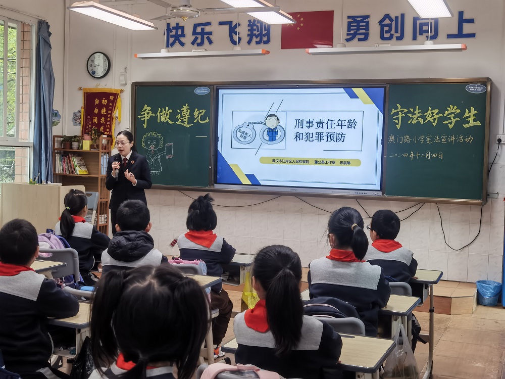 二是法治春雨润泽成长沃土。实施“法治副校长红色工程”,36名党员干警担任江岸区71所中小学的法治副校长,每年通过线下公开课、线上视频课等多种途径开展送法进校园活动160余次,实现全区学校全覆盖。创新“点单式”普法,研发“红色法治”系列课程,获得江岸区教育局和在校师生广泛好评。同时,积极利用新媒体平台,制作的微视频《依法带娃,有你有我》、微电影《不惧未来》分别荣获平安湖北“三微”比赛一等奖和武汉市党员教育电视片观摩交流活动一等奖。