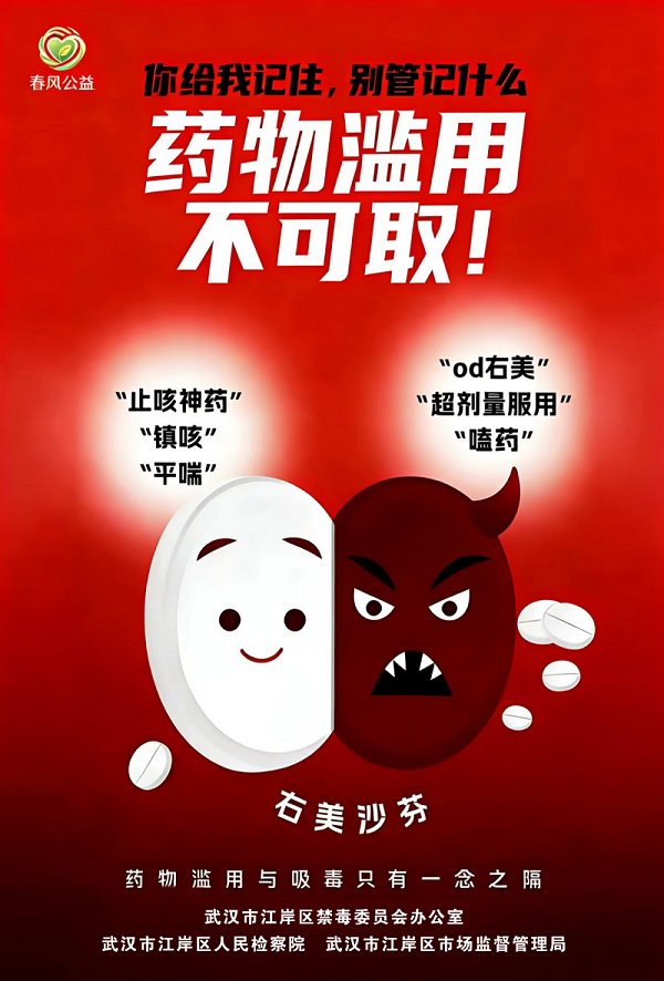 右美沙芬是临床常用镇咳药,常规剂量使用安全有效,但超剂量滥用便会突破“药”与“毒”的界限,成为成瘾性物质,可能引发幻觉、精神恍惚等症状,长期滥用还会造成大脑损伤、心律不齐等严重后果。针对这一问题,江岸区检察院“春风公益”团队向区市场监督管理局制发社会治理检察建议,紧盯药品网络销售、使用等关键环节,联合相关部门开展专题研判、明确整治重点,推动禁毒宣传与药物滥用防范深度融合。