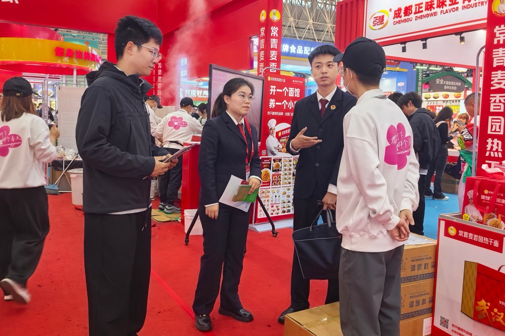 热闹的展会现场,知识产权检察部副主任周婧带领团队成员韩雨辰、王钊,直奔企业需求痛点。针对食材企业生产经营中最关心的非遗技艺与老字号品牌保护、地理标志规范使用、商标侵权防范、产品外观专利维权、电商平台侵权取证等问题,团队为参展的本土企业及商户提供一对一专业解答。