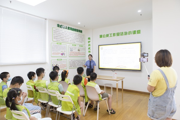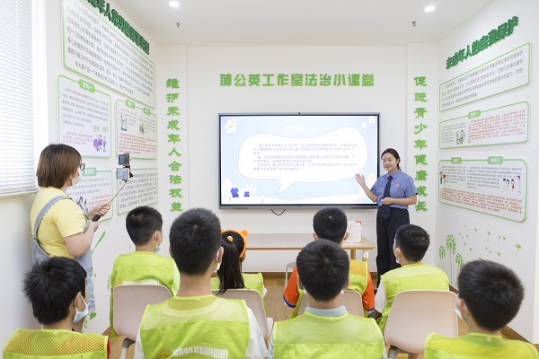 一阵轻快的童声童语从蒲公英工作室内传出,走进蒲公英工作室内,一群穿着绿马甲的暑期托管班的小朋友们高高的举起了小手,抢着回答蒲公英姐姐提出的法律小问题。