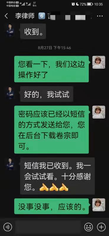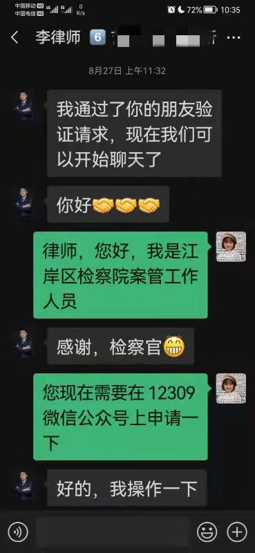 8月26日,江岸区人民检察院受理了一起异地网络阅卷申请,由于辩护人李律师不熟悉申请流程,该院案管部门工作人员主动提出通过添加微信指导操作的方式帮助律师完成操作申请。短短几分钟后,在工作人员的帮助下,李律师完成了信息绑定、点击申请在线阅卷等步骤。随后,工作人员在后台迅速进行了审核处理,李律师在收到短信密码后通过平台完成了电子卷宗的下载和查看。